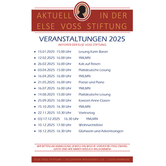 Wir bieten ein umfassendes und abwechslungsreiches Veranstaltungsprogramm an: Vorträge, Konzerte, Museumsbesuche, Filme, Ausflüge, Kochen bei Else, Bibliothek, Sport, Kaffeeklatsch, Grillfeste und vieles mehr.